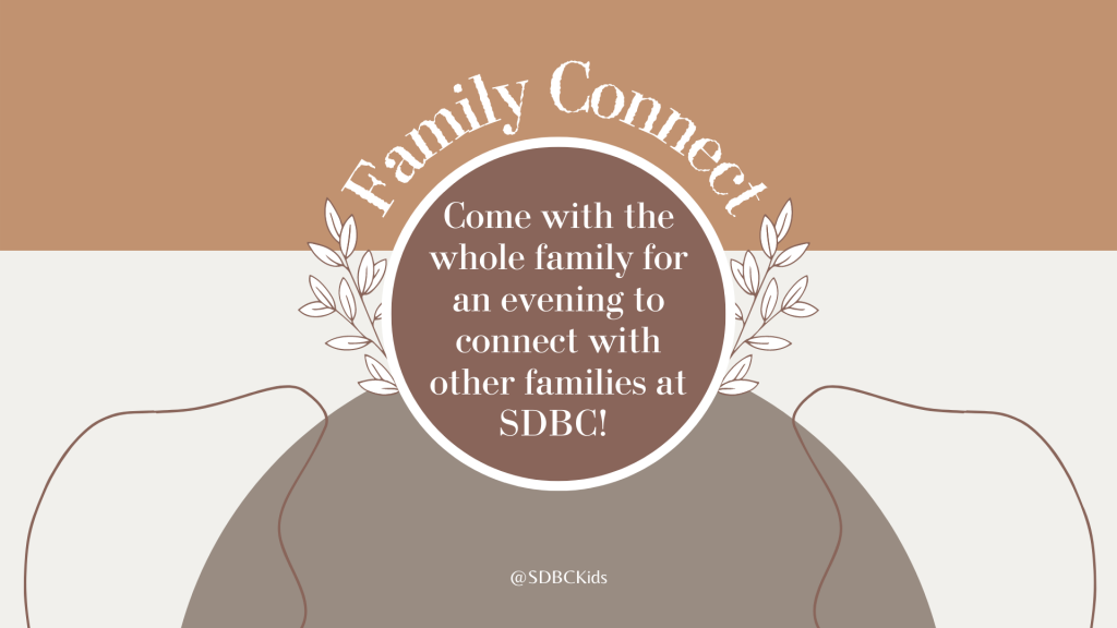 Come spend some time with SDBC Kids! On October 21st from 6:30-8PM (or whenever your kids need to go to bed), come spend time at our Family Connect Night. We will be hanging out, playing some games as a family, and then the kids will hang out with our SDBC Kids team while parents get to spend time in fellowship with each other. We can't wait to spend time with you guys!